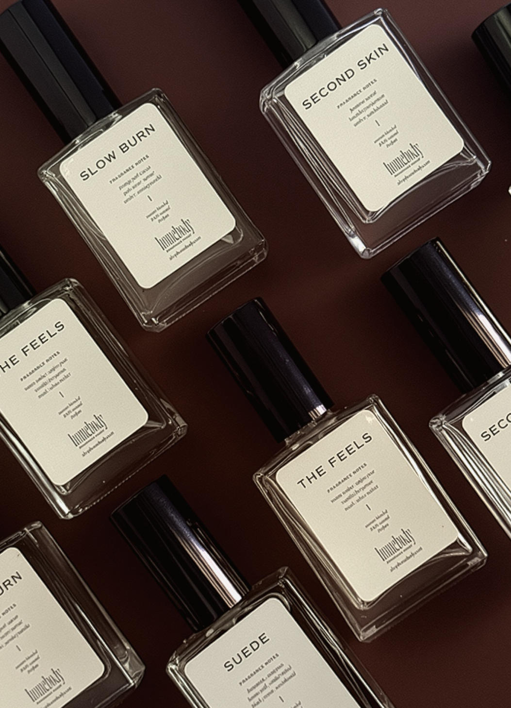 Each blend begins with a natural base — virgin coconut soy wax for a clean, even burn, and organic cane alcohol for a soft, skin-safe perfume experience. -